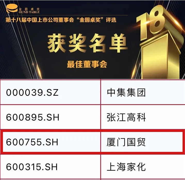 廈門國(guó)貿(mào)榮獲“金圓桌獎(jiǎng)”公司獎(jiǎng)最佳董事會(huì)。