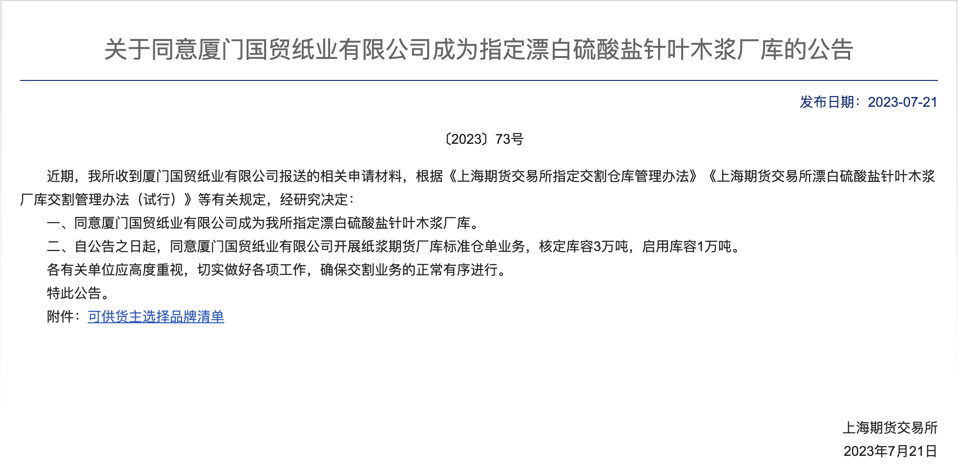 國(guó)貿(mào)紙業(yè)成功獲批漂白硫酸鹽針葉木漿廠庫(kù)資質(zhì),該資質(zhì)為國(guó)貿(mào)股份于上期所取得的首個(gè)期貨交割庫(kù)資質(zhì)。